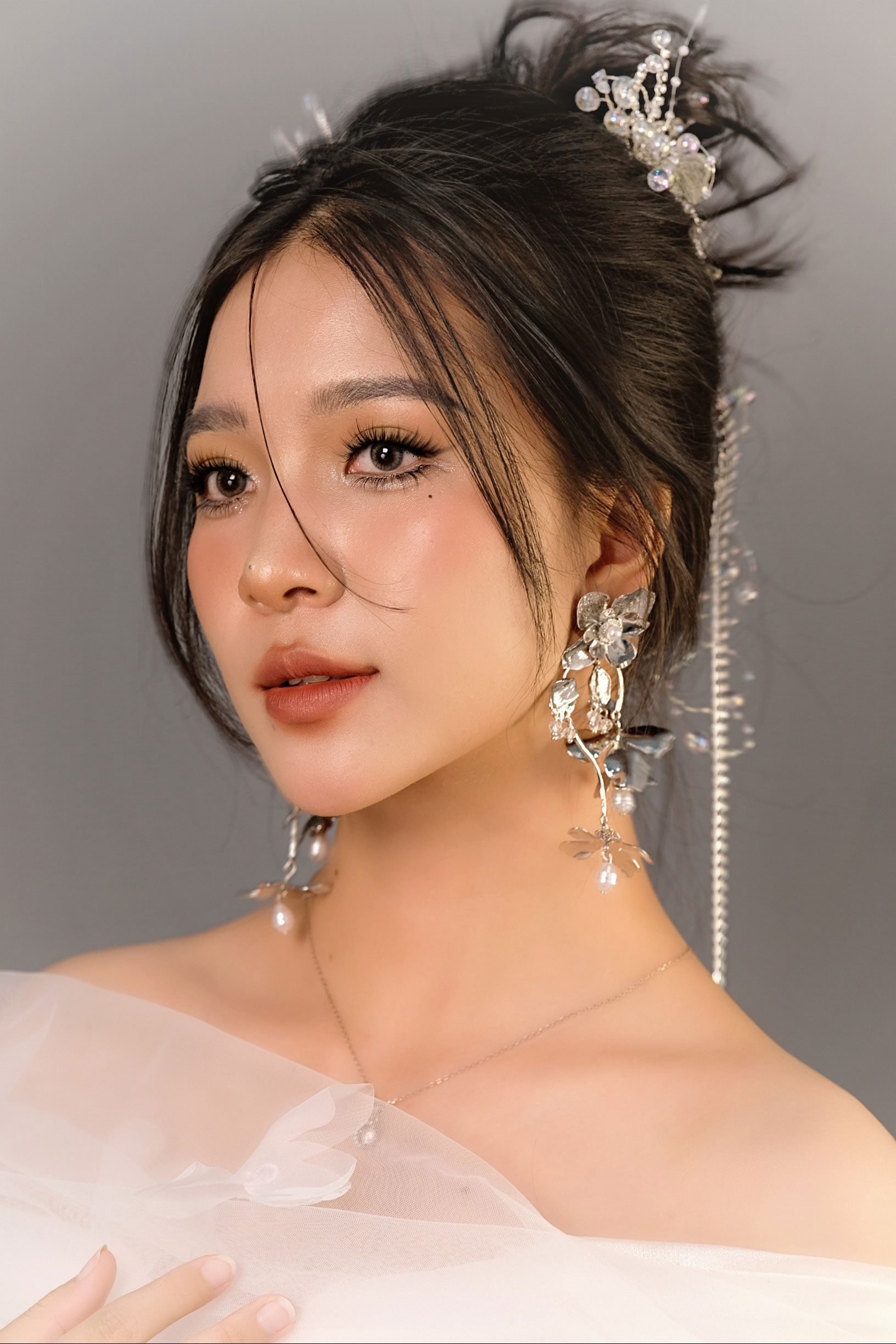 Lông mày dùng chì đá, phẩy theo đúng chiều lông mày thật. Không cần tán bột. Lông mày dùng chì đá, phẩy theo đúng chiều lông mày thật. Không cần tán bột. Màu mắt: dùng tone màu nâu, cam nhiều sắc độ. Tán theo kĩ thuật tán màu mắt ngang đậm từ chân mi nhạt dần về bầu mắt, tạo cảm giác mắt tròn to. Màu mắt: dùng tone màu nâu, cam nhiều sắc độ. Tán theo kĩ thuật tán màu mắt ngang đậm từ chân mi nhạt dần về bầu mắt, tạo cảm giác mắt tròn to. Lông mi: bấm cong mi thật, dùng mi gân đen để kích tạo nếp mí. Sau có dùng mi chùm điểm thưa theo kĩ thuật mi đa tầng để mắt có điểm nhấn. Lông mi: bấm cong mi thật, dùng mi gân đen để kích tạo nếp mí. Sau có dùng mi chùm điểm thưa theo kĩ thuật mi đa tầng để mắt có điểm nhấn. Môi: dùng phấn mắt tạo độ loang ở phần viền môi, và tạo hình khuôn môi hình trái tim.
